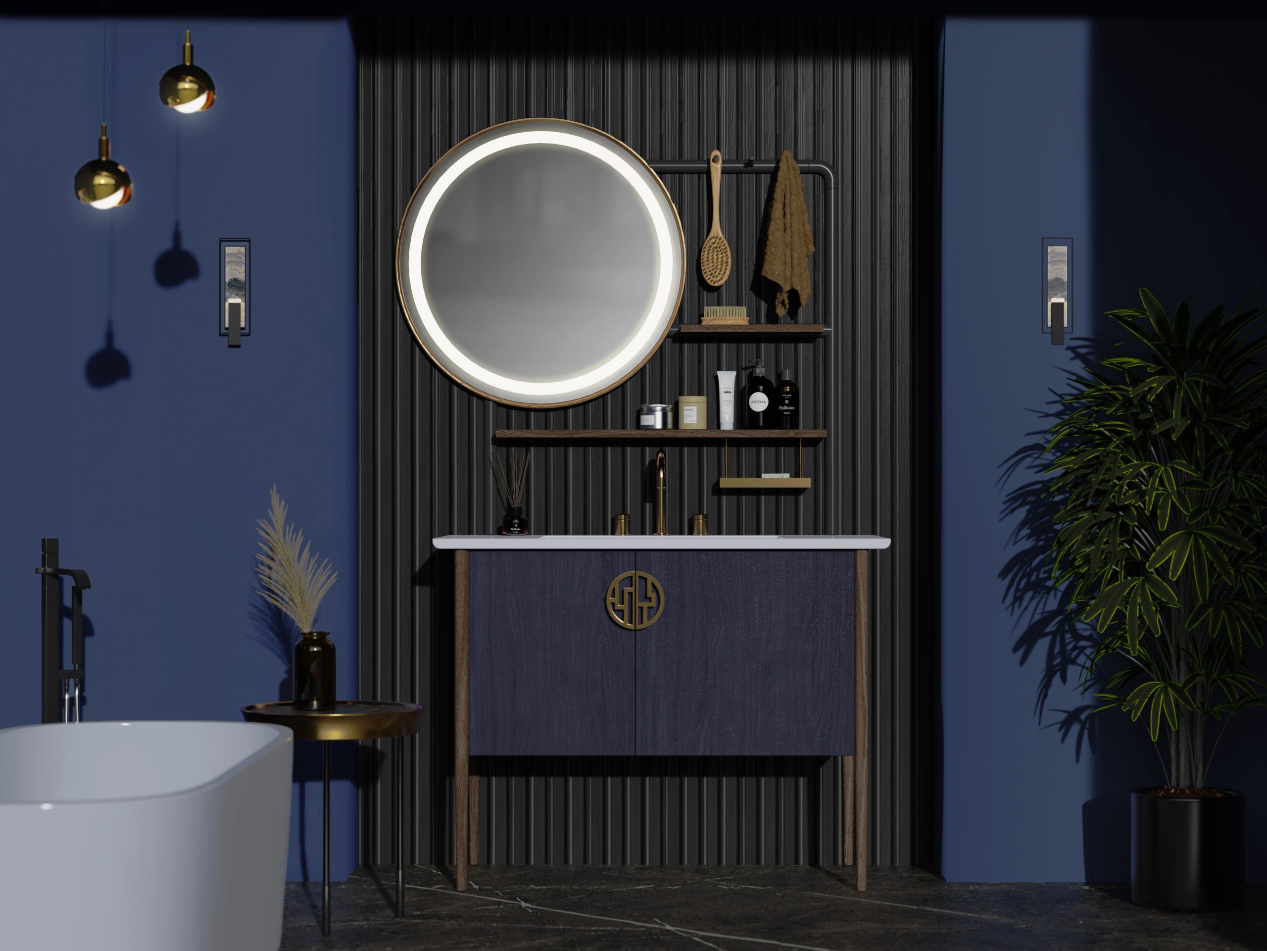 將“天圓地方”的中國傳統概念與現代設計手法相結合的新中式浴室柜,圓圓的鏡子也宛如一輪圓月高掛空中。